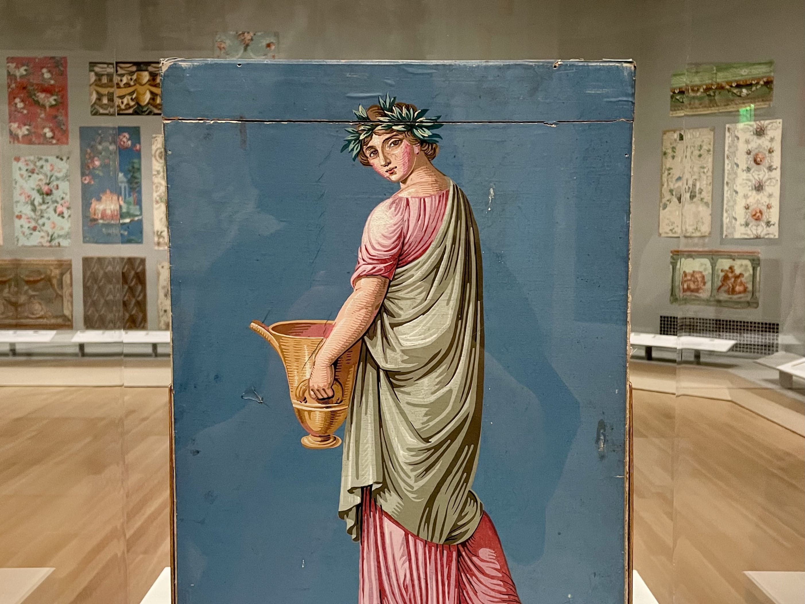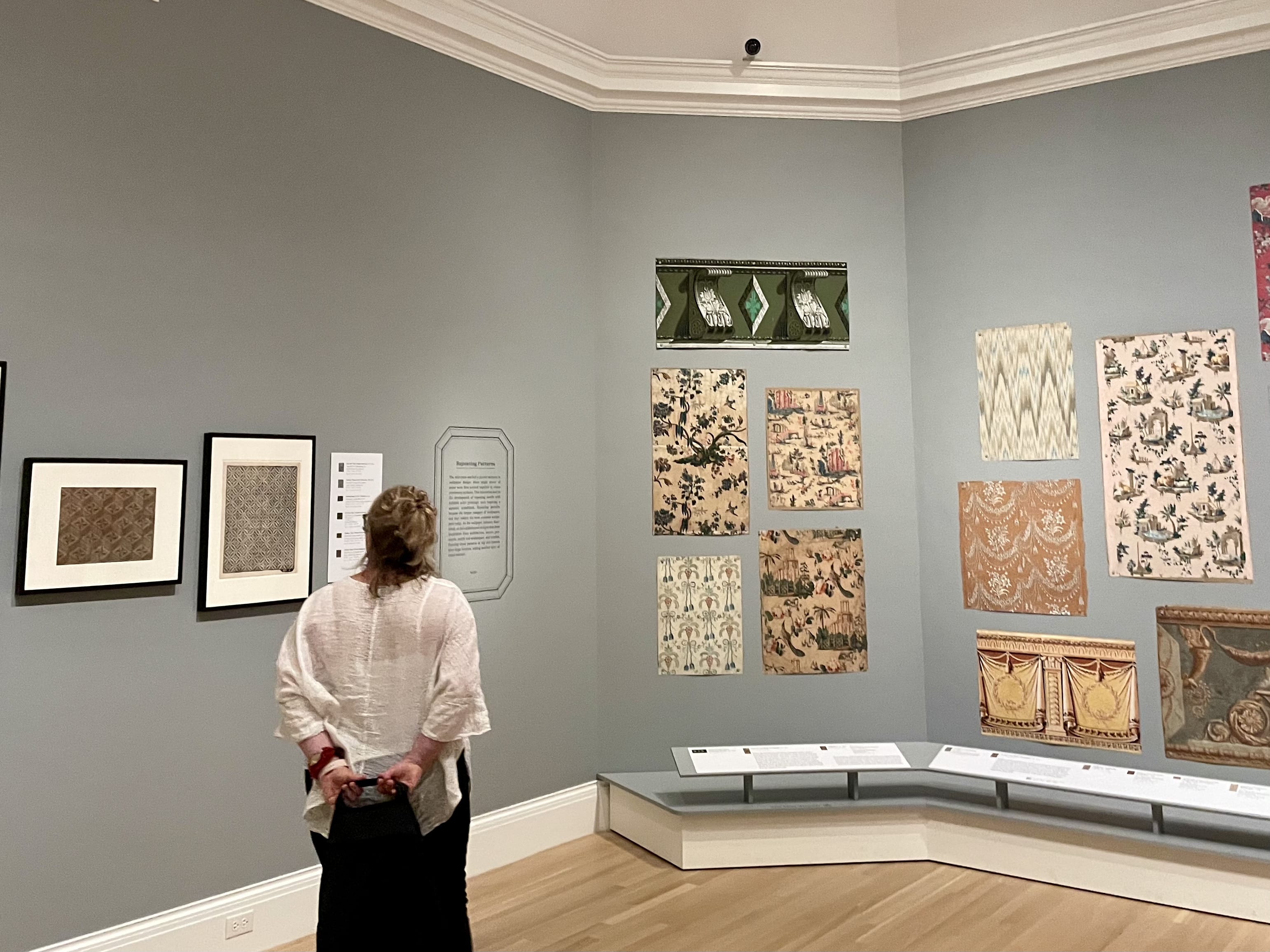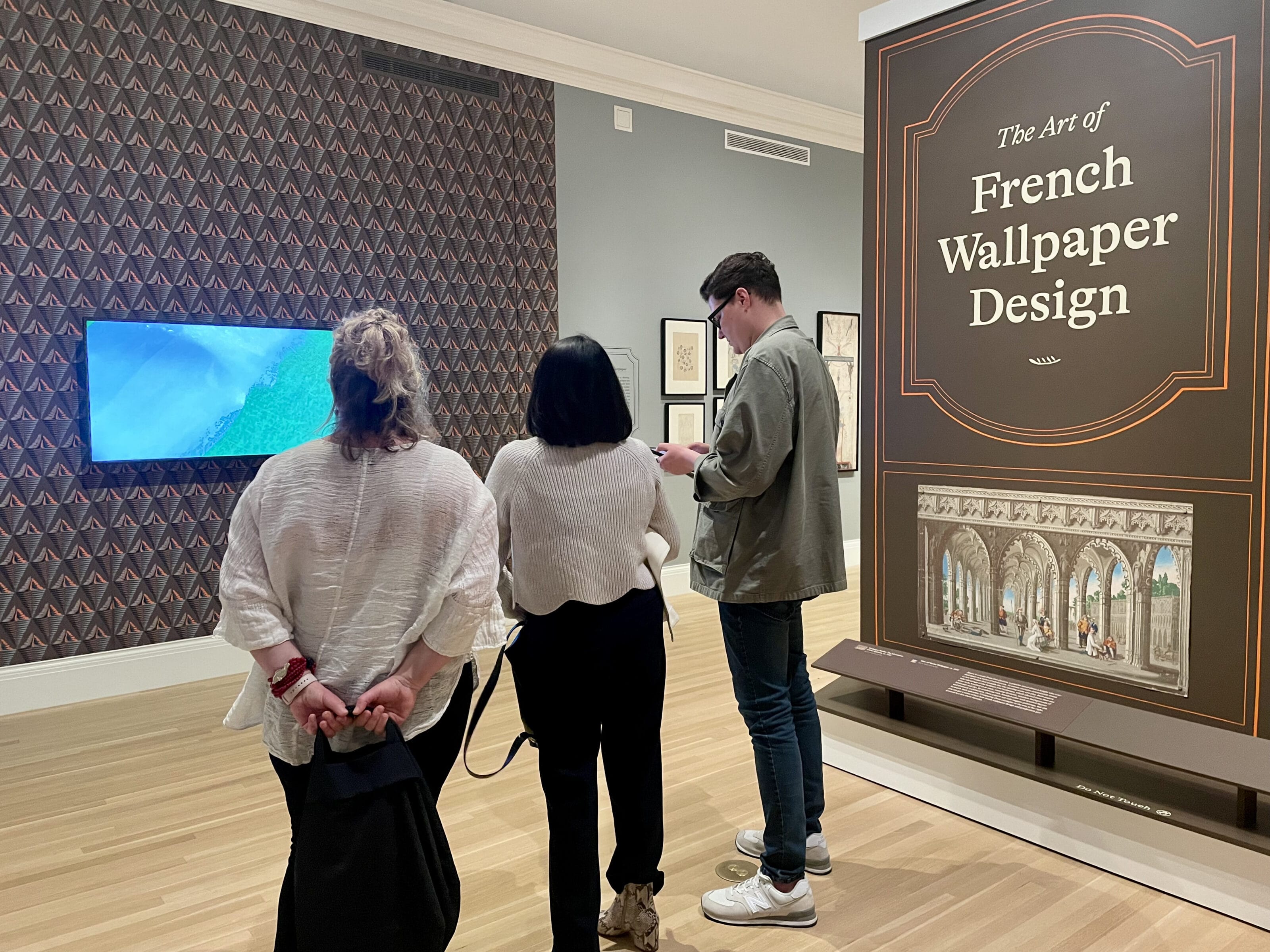 Last week, CoDesign Collaborative members, with Board and Council leadership took the train to Providence to visit The Art of French Wallpaper Design at the RISD Museum before it closed on May 12, 2025. The exhibition explored the vibrant and surprising designs that adorned walls in the 1700s and 1800s, presenting more than one-hundred rare and striking samples of salvaged wallpapers, borders, fragments, and design drawings. Our group was taken by the creative process and technical skills involved in producing the wallpaper panels, from wood block engraving to hand painting neoclassical architectural fantasies, lush florals, and exotic vistas. The decorative, storytelling backdrops bridged fine art and industrial design.